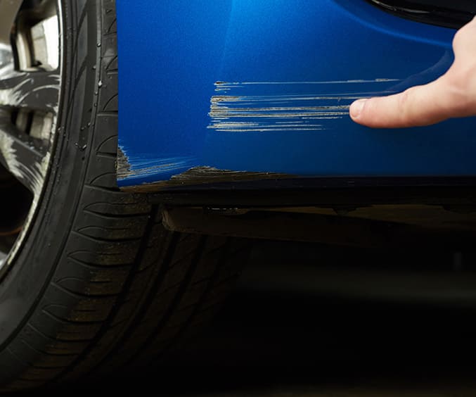 ・車で曲がるときに内輪差で壁にぶつかり、ドアとフェンダーが大きくへこんで傷ができた